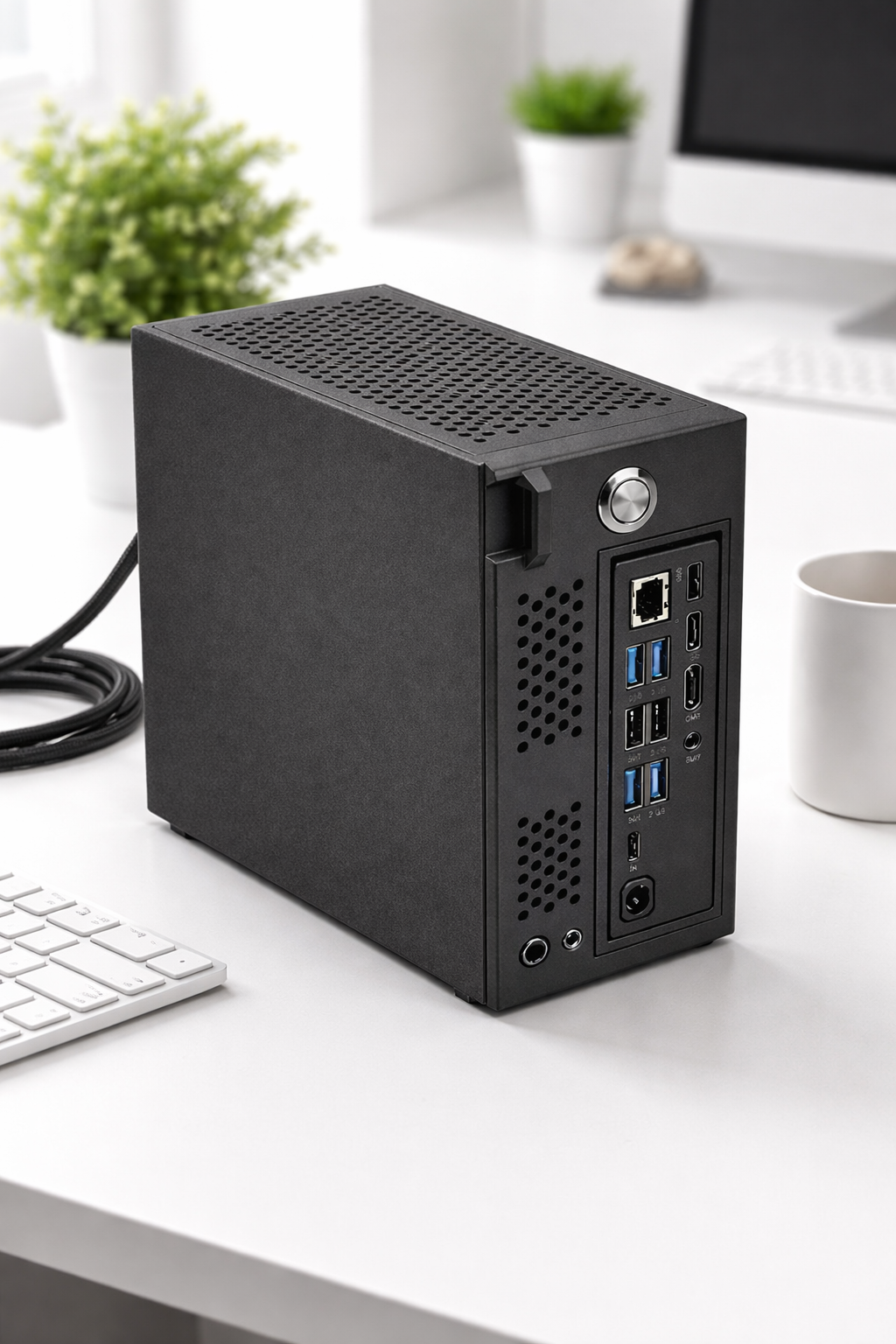 Ultra compact 30 × 30 × 12 cm NAS cabinet, perfect for desks, offices, studios, and home setups.