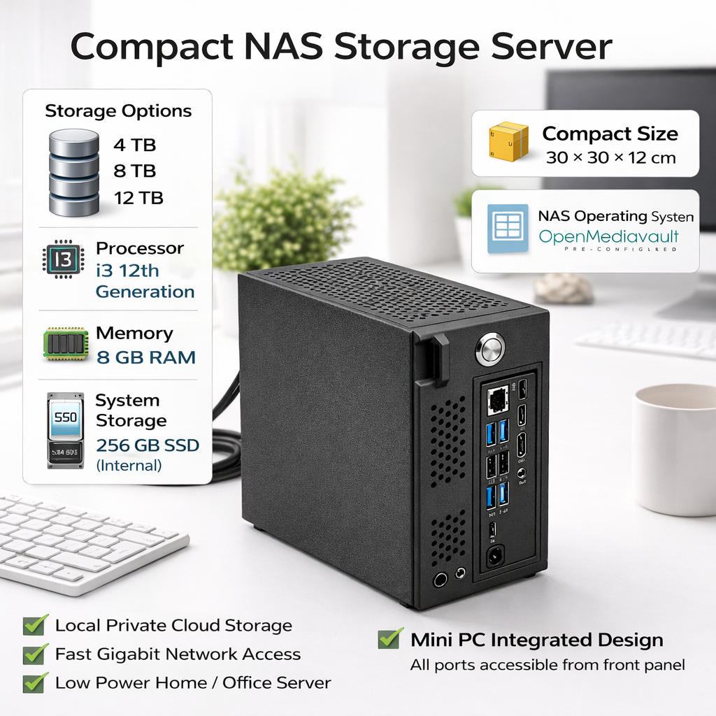 Compact NAS Storage Server | 4TB / 8TB / 12TB Options | Intel i3 12th Gen | 8GB RAM | 256GB SSD OS | OpenMediaVault NAS | Private Cloud Storage | Home / Office Network Storage