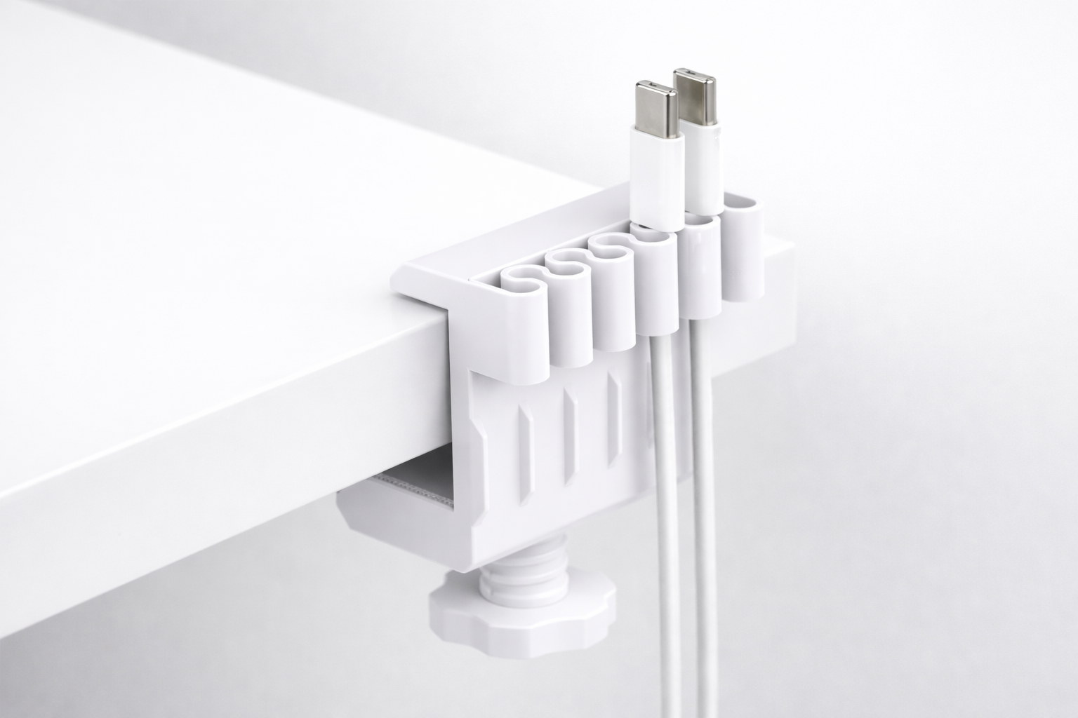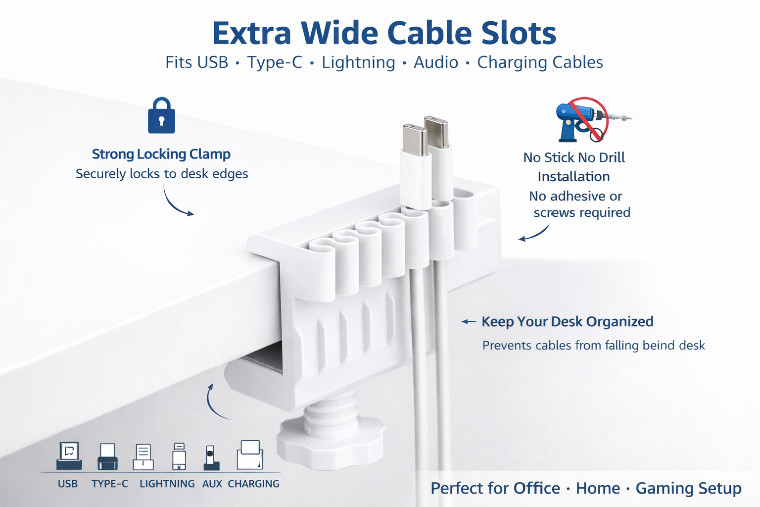 Keep your workspace neat and organized with this Desk Cable Organizer Clamp Mount, designed to prevent cables from falling behind your desk and creating clutter. This smart cable management solution securely attaches to your desk edge using a strong locking clamp system, eliminating the need for adhesive tapes, drilling, or screws.