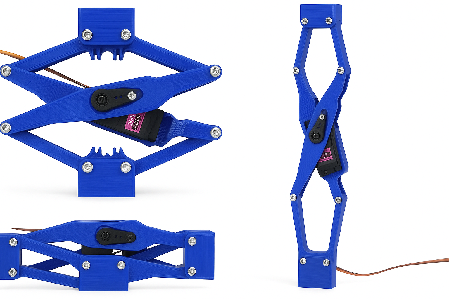 Compact and lightweight 3D printed scissor jack mechanism designed for MG996R servo motors. Ideal for DIY robotics, automation projects, lifting platforms, and STEM learning applications.