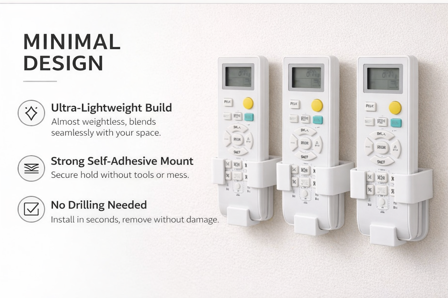 This Pack of 3 wall-mounted remote holders is ideal for homes, offices, hotels, and rental properties.
